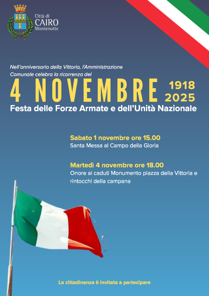 A tutti i Cairesi l’augurio di vivere a pieno questa Festa, nella speranza che le riflessioni scaturite da essa, insieme alla rilettura della nostra Costituzione, possano garantirci un futuro di libertà, diritti e fratellanza».