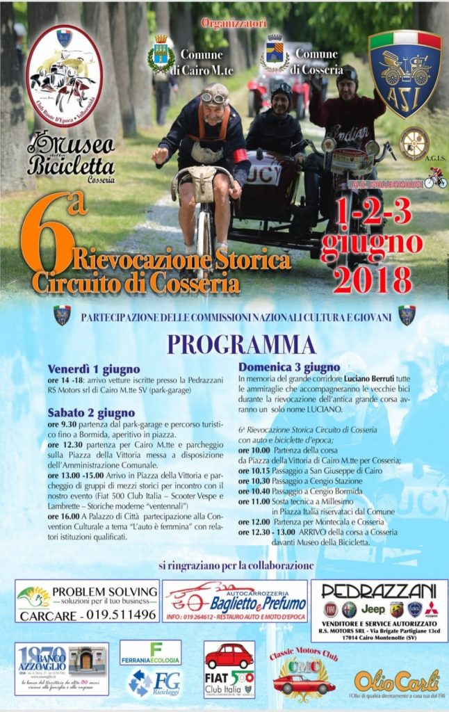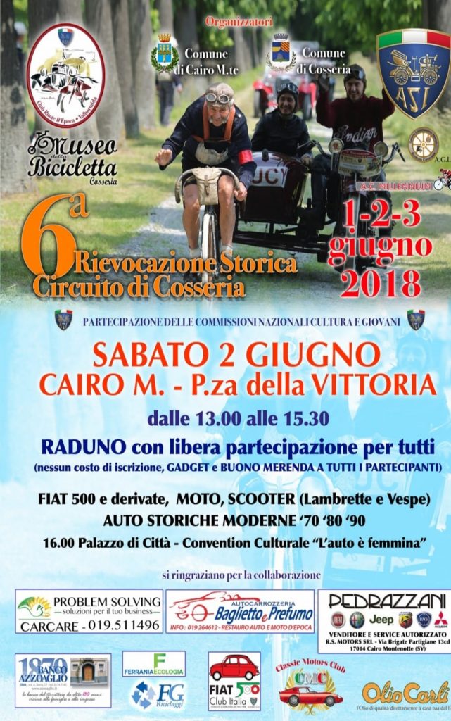 Il 1, 2 e 3 giugno 2018 si svolgerà la 6^ Rievocazione Storica del Circuito di Cosseria, organizzata da “Club Ruote d’Epoca Valbormida” di Millesimo, in collaborazione con l’Amministrazione Comunale. Il 2 giugno raduno in Piazza della Vittoria e Convegno a Palazzo di Città.