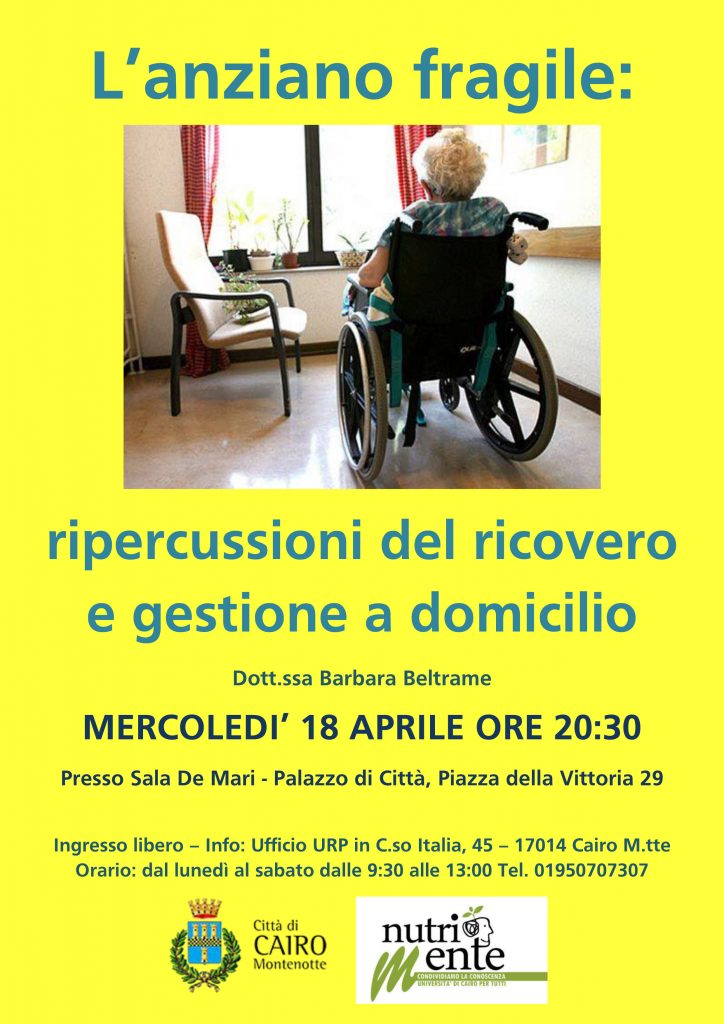 Mercoledì 18 aprile 2018, alle ore 20,30, presso la Sala De Mari di Palazzo di Città, nell’ambito del ciclo di lezioni di NutriMente, la Dott.ssa Barbara Beltrame parlerà di “L’anziano fragile: ripercussioni del ricovero e gestione a domicilio”. Ingresso libero.