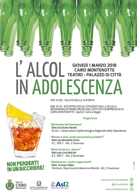 “L’alcol in adolescenza” è il tema del Convegno promosso dall’Amministrazione comunale con l’Istituto Comprensivo e l’Asl 2 Savonese, che si svolgerà giovedì 1 marzo, con inizio alle ore 10,00 presso il Teatro Comunale “Chebello”.