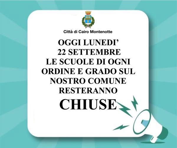 Il Sindaco con propria ordinanza ha disposto la chiusura delle scuole pubbliche e private di ogni ordine e grado, compresi gli asili nido, insistenti sul territorio del Comune di Cairo Montenotte, LUNEDI’ VENTIDUE SETTEMBRE 2025 a causa della emissione dell’allerta arancione e della situazione in atto.