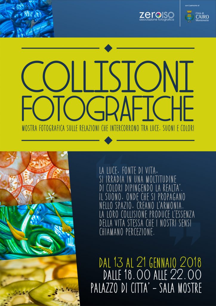 La mostra “Collisioni Fotografiche” vuole indagare le relazioni che intercorrono tra la luce, i suoni e i colori, proponendo 150 fotografie realizzate da 22 fotografi, soci dell’associazione “ZeroISO”, che presentano, ciascuno con il proprio stile, immagini che diventano poesia, ritratti che sembrano dipinti, contrasti tra luci, ombre e colori.