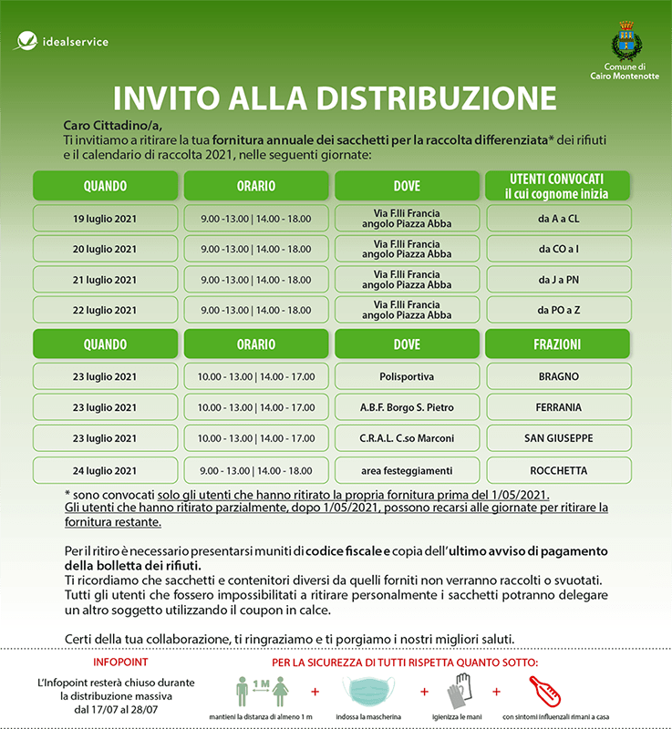 Nel periodo da lunedì 19 a sabato 24 luglio 2021 la ditta Idealservice, che gestisce il servizio di raccolta differenziata sul territorio del Comune di Cairo Montenotte, provvederà alla distribuzione della fornitura annuale gratuita dei sacchetti.