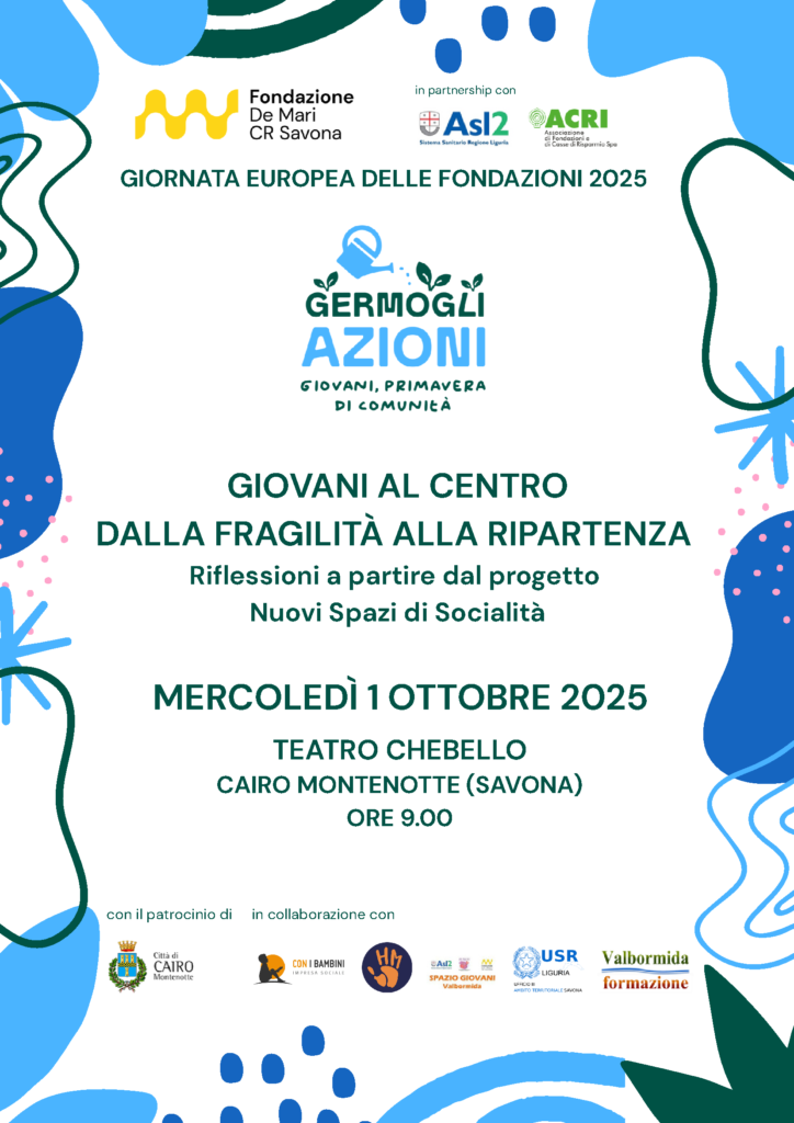 In occasione della tredicesima Giornata Europea delle Fondazioni, la Fondazione De Mari CR Savona, in collaborazione con ASL2 Savonese, promuove l’incontro “Giovani al Centro. Dalla fragilità alla ripartenza. Riflessioni a partire dal progetto Nuovi Spazi di Socialità”, in programma