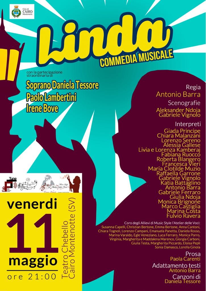 Venerdì 11 maggio 2018 alle h21 presso il Teatro “Chebello” di Cairo M.tte andrà in scena: “Linda” – Commedia Musicale – Prosa di Paola Carenti, Canzoni (Testi e Musiche) di Daniela Tessore e Regia di Antonio Barra, sarà una versione rivisitata, con nuovi personaggi e testi adattati dal regista.
