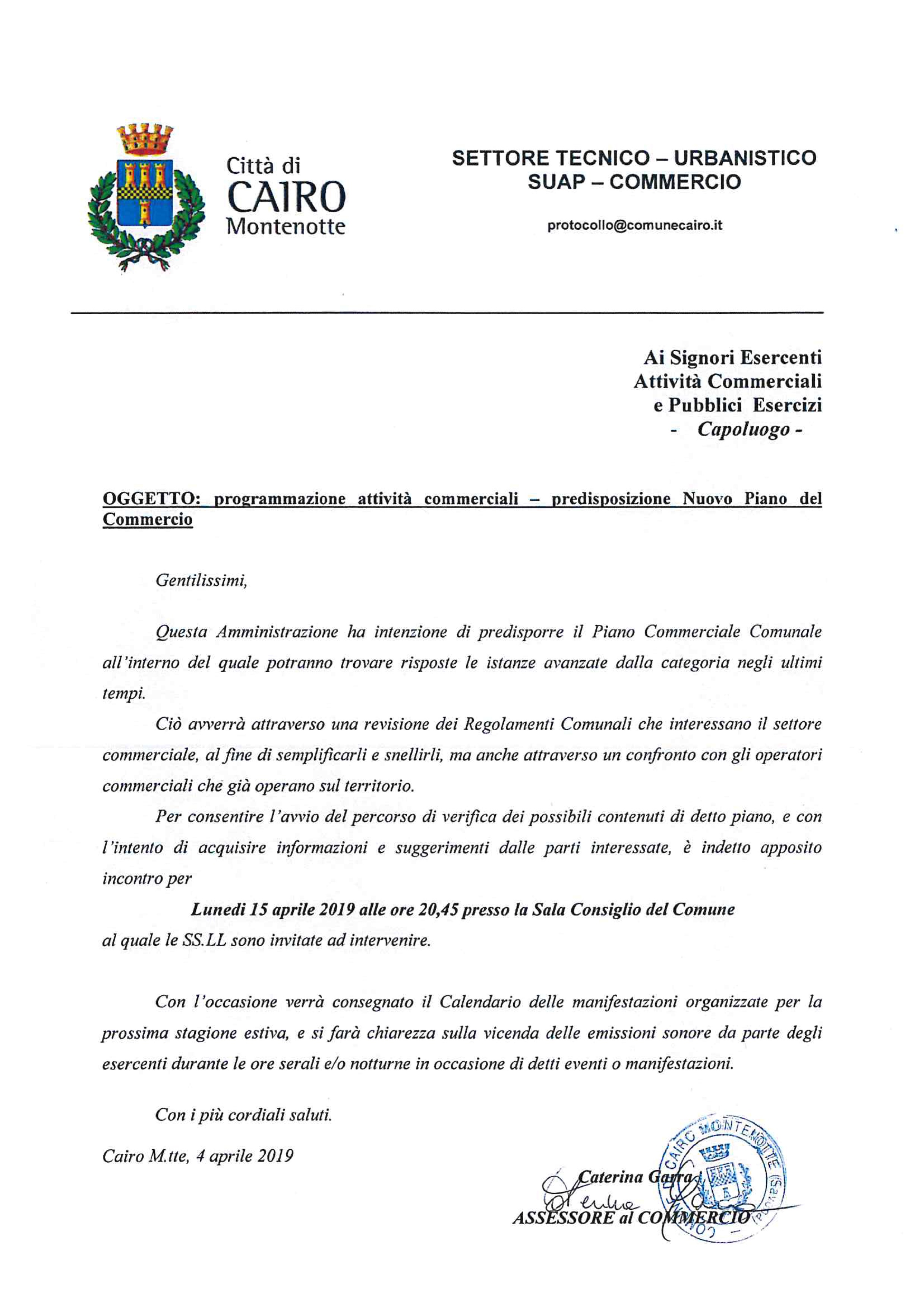Questa Amministrazione ha intenzione di predisporre un nuovo Piano Commerciale Comunale all’interno del quale potranno trovare risposte le istanze avanzate dalla categoria negli ultimi tempi, per questo si terrà un incontro con le parti interessate lunedì 15 aprile 2019 alle ore 20,45 presso la Sala Consiliare del Comune, in Corso Italia 45, secondo piano.