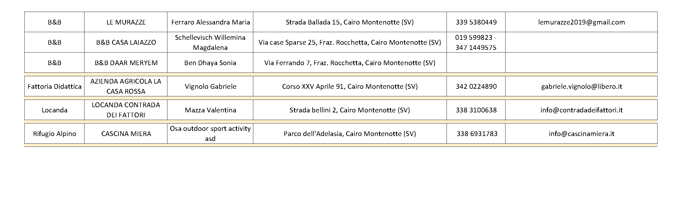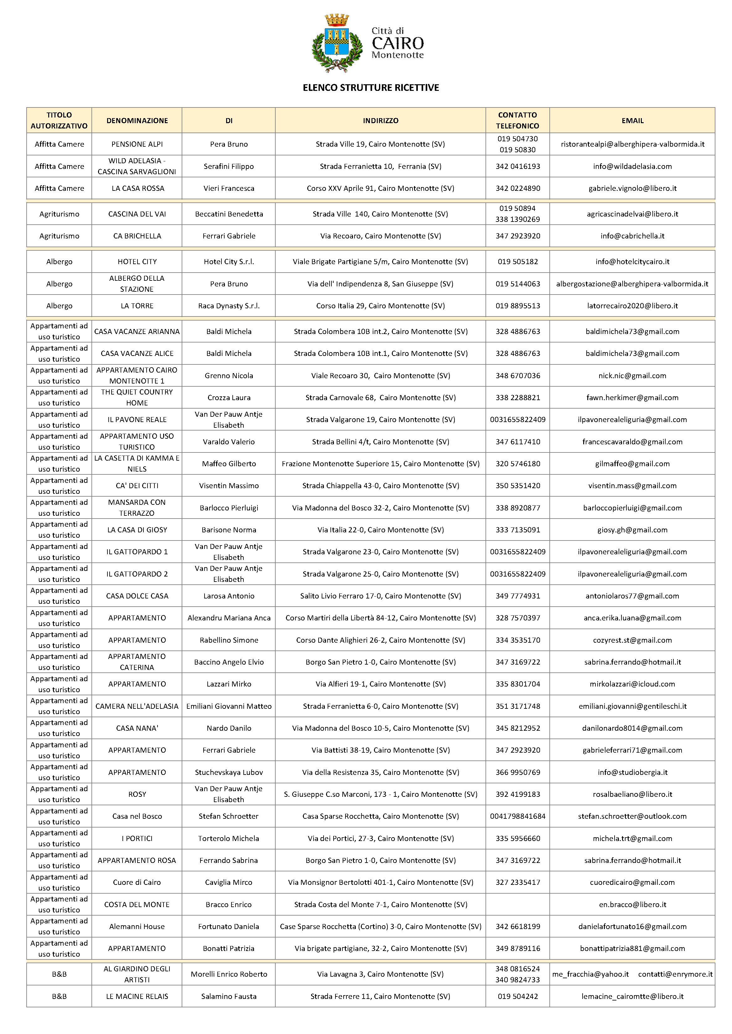Le informazioni relative alle strutture ricettive liguri, tra cui quelle ubicate nel territorio di Cairo Montenotte, sono raccolte nell’apposita sezione dedicata all’ospitalità: