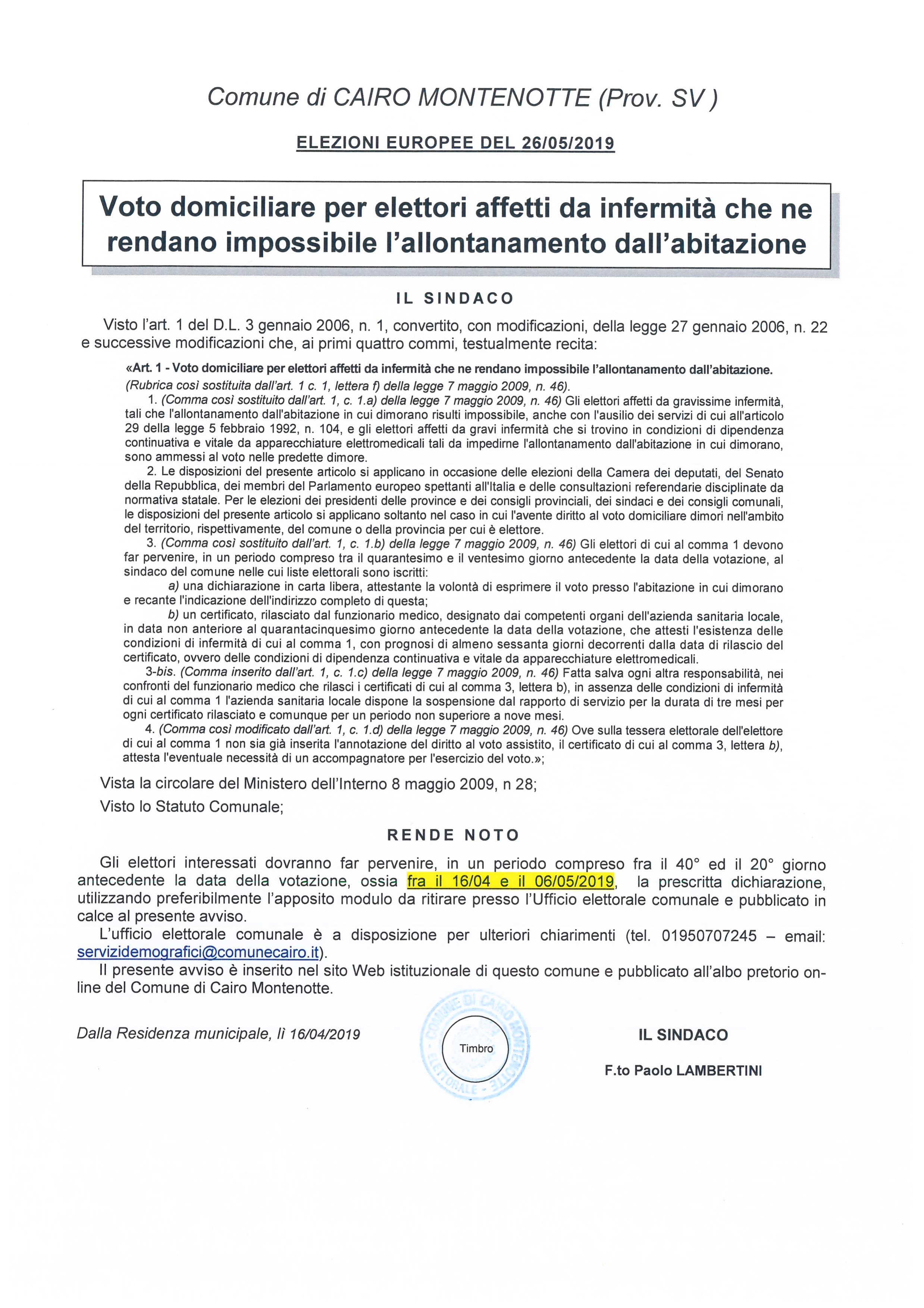 Entro il prossimo 6 maggio le persone interessate dovranno inviare al Sindaco una dichiarazione dove manifestano la volontà di votare presso l’abitazione nella quale dimorano, allegando il certificato medico attestante lo stato di grave infermità fisica o la dipendenza continuativa e vitale da apparecchiature elettromedicali che gli impedisce l’allontanamento dalla propria abitazione per recarsi al seggio. Il certificato non può avere data precedente all’11 aprile 2019, quarantacinquesimo giorno precedente la data delle votazioni e deve recare una previsione di infermità di almeno sessanta giorni dalla data di rilascio.